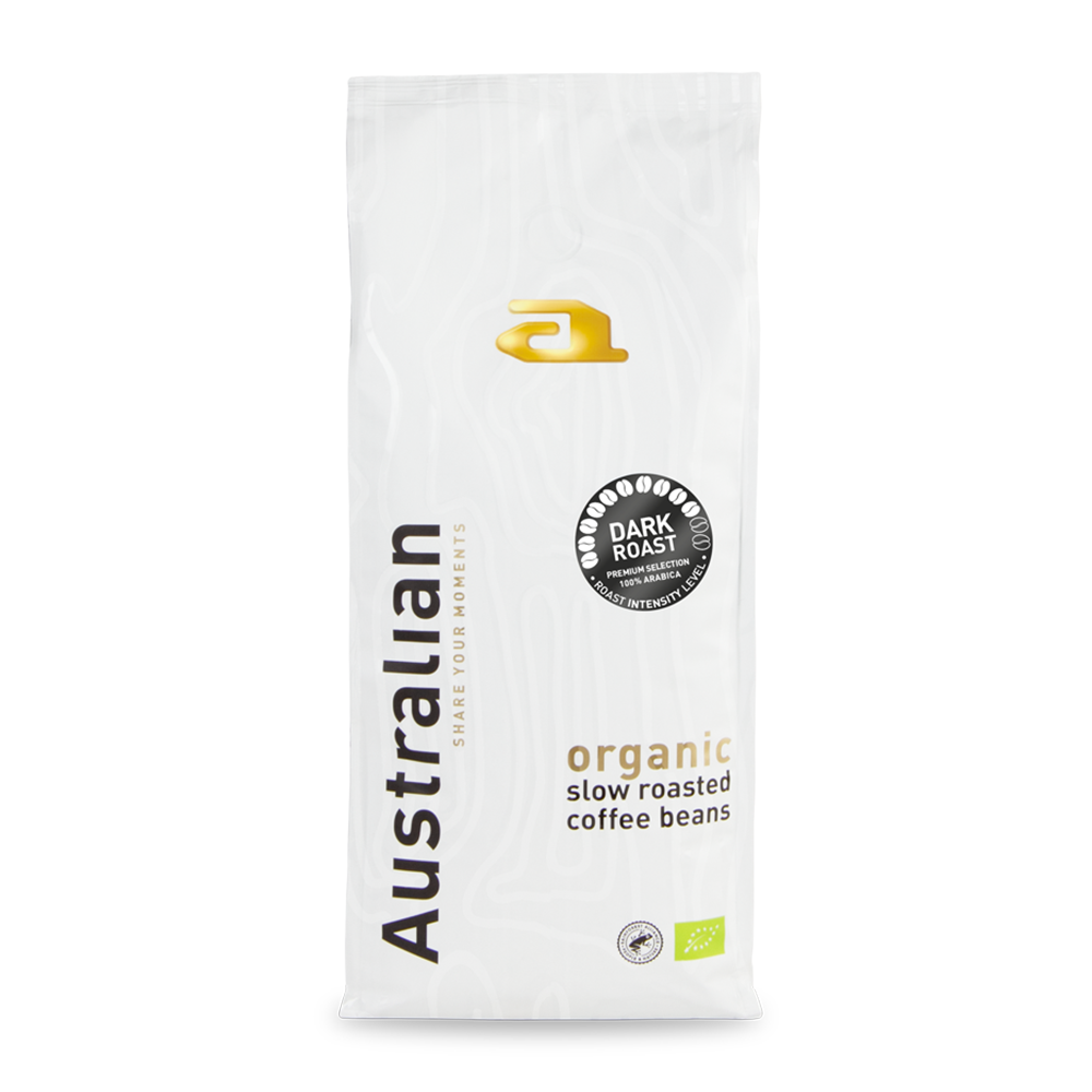 Biologische koffiebonen, donker gebrand, krachtige smaak met volle body. Intensiteit: 10 uit 12.