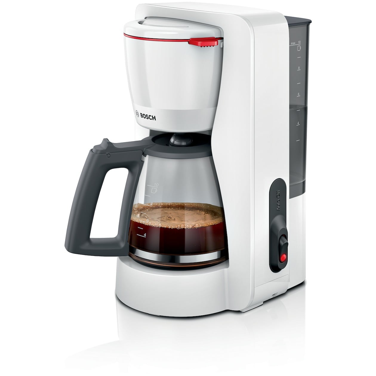 Ontdek de Bosch TKA2M111 Wit, het filterkoffiezetapparaat dat design en functionaliteit combineert voor jouw perfecte koffiemoment. Met een capaciteit van 1,37 liter kun je tot 15 kopjes heerlijke koffie zetten, ideaal voor zowel kleine als grote gezelschappen. De aroma glaskan zorgt ervoor dat de koffie zijn volle smaak behoudt, terwijl de warmhoudplaat je koffie lekker warm houdt. Met een aansluitwaarde van 1000-1200 Watt is dit apparaat niet alleen krachtig, maar ook energiezuinig. Het comfort van de Bosch TKA2M111 Wit wordt versterkt door het transparante, uitneembare waterreservoir met een duidelijke vulstandindicatie en geïntegreerd handvat, waardoor je het waterniveau gemakkelijk kunt aflezen. Het 'swing-out' filter is uitneembaar, wat het vervangen van de koffiefilter (1×4) een fluitje van een cent maakt. De druppelstop voorkomt knoeien en verspilling van koffie. Bovendien is het apparaat eenvoudig op te bergen dankzij het snoeropbergvak. De verlichte aan-/uitschakelaar zorgt