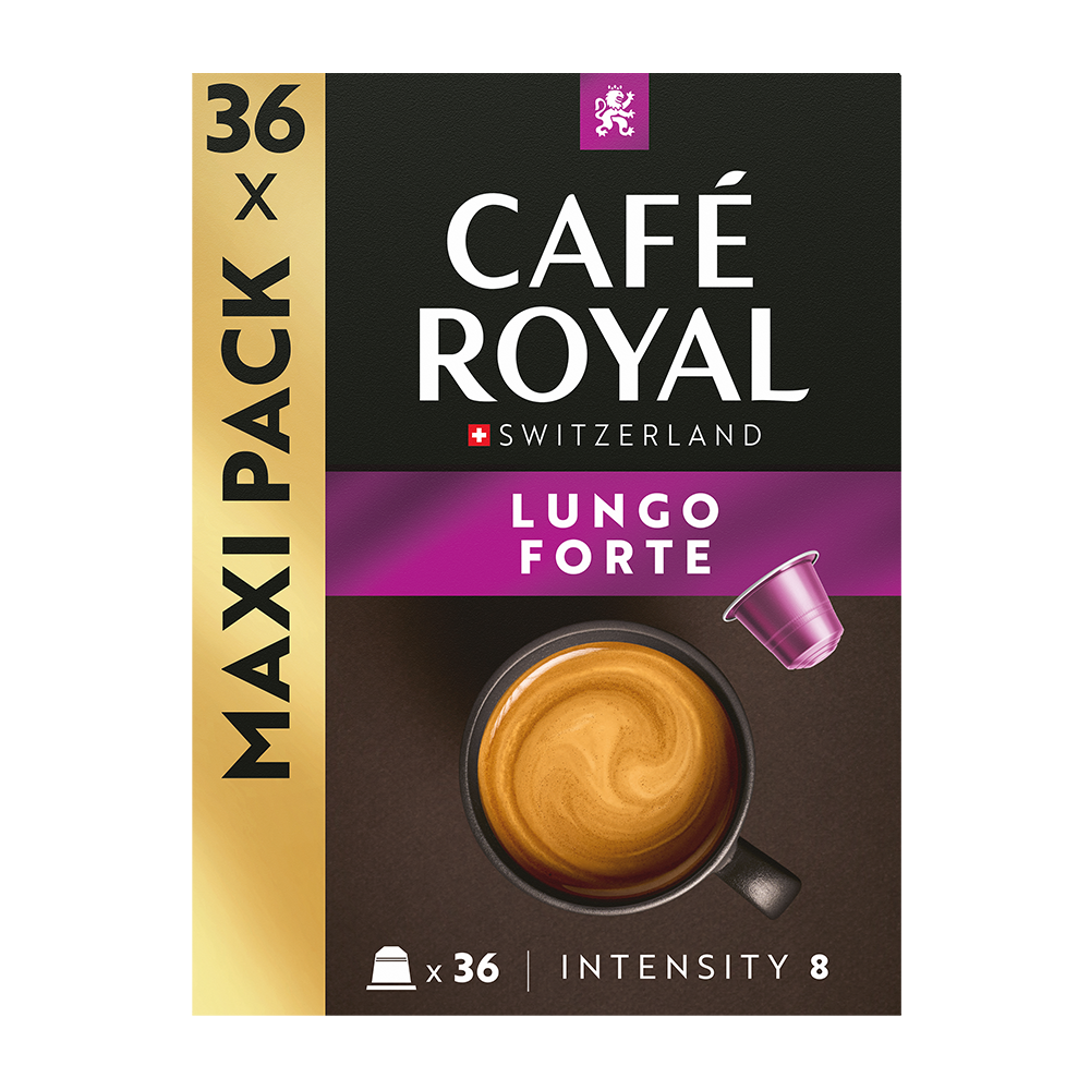 Op zoek naar een krachtige kop koffie? Kies dan voor de Lungo Forte van Café Royal voor uw Nespresso® apparaat! Deze robuuste koffie laat een unieke en intense geur van gebrande koffiebonen achter. Perfect voor liefhebbers van een stevige kop koffie. (per 36 capsules)