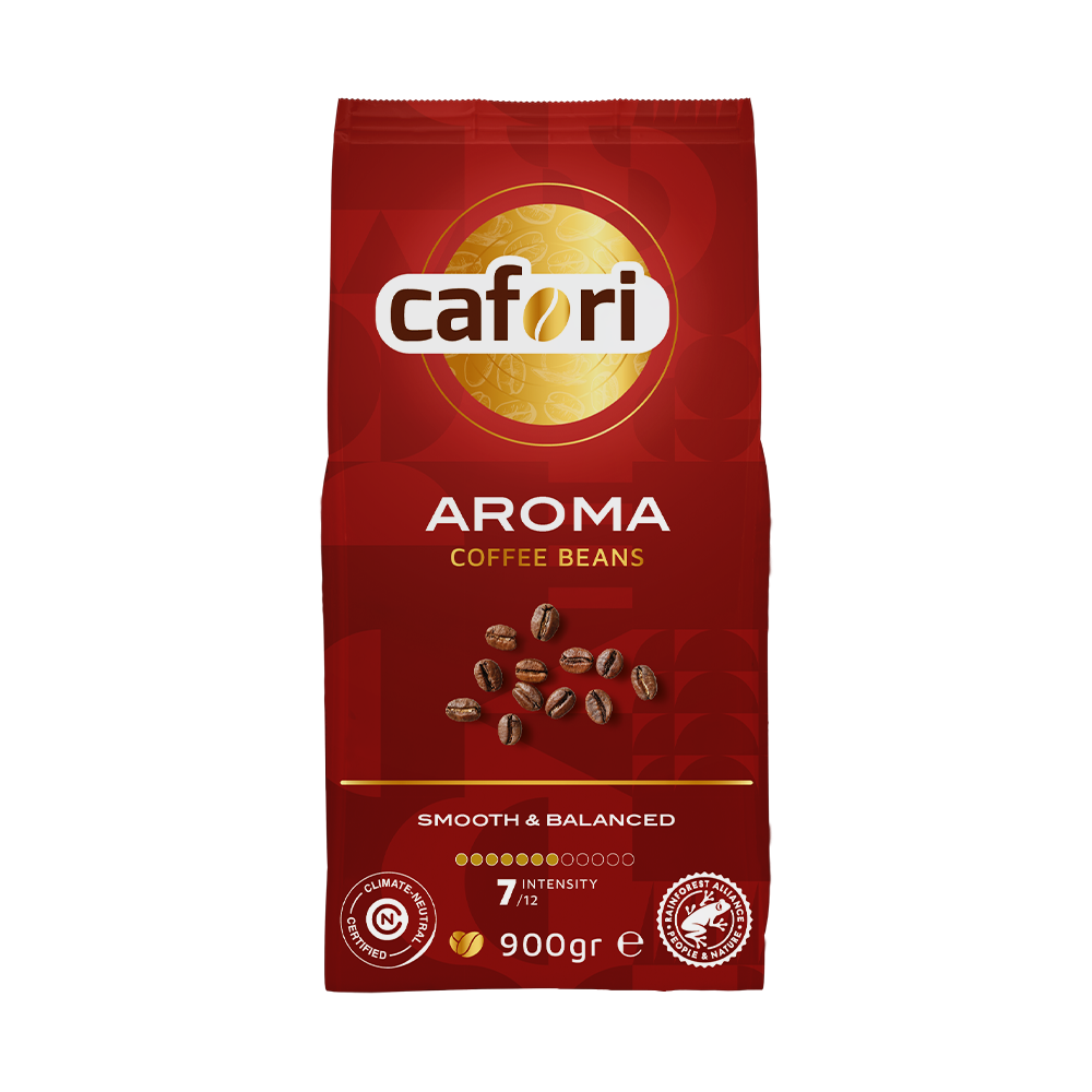 Intensiteit 7/12 – Met Cafori Aroma koffiebonen proef je precies wat je verwacht als je een rode koffieverpakking ziet. Gewoon, lekkere recht-door-zee koffie die vol van smaak en aroma is.