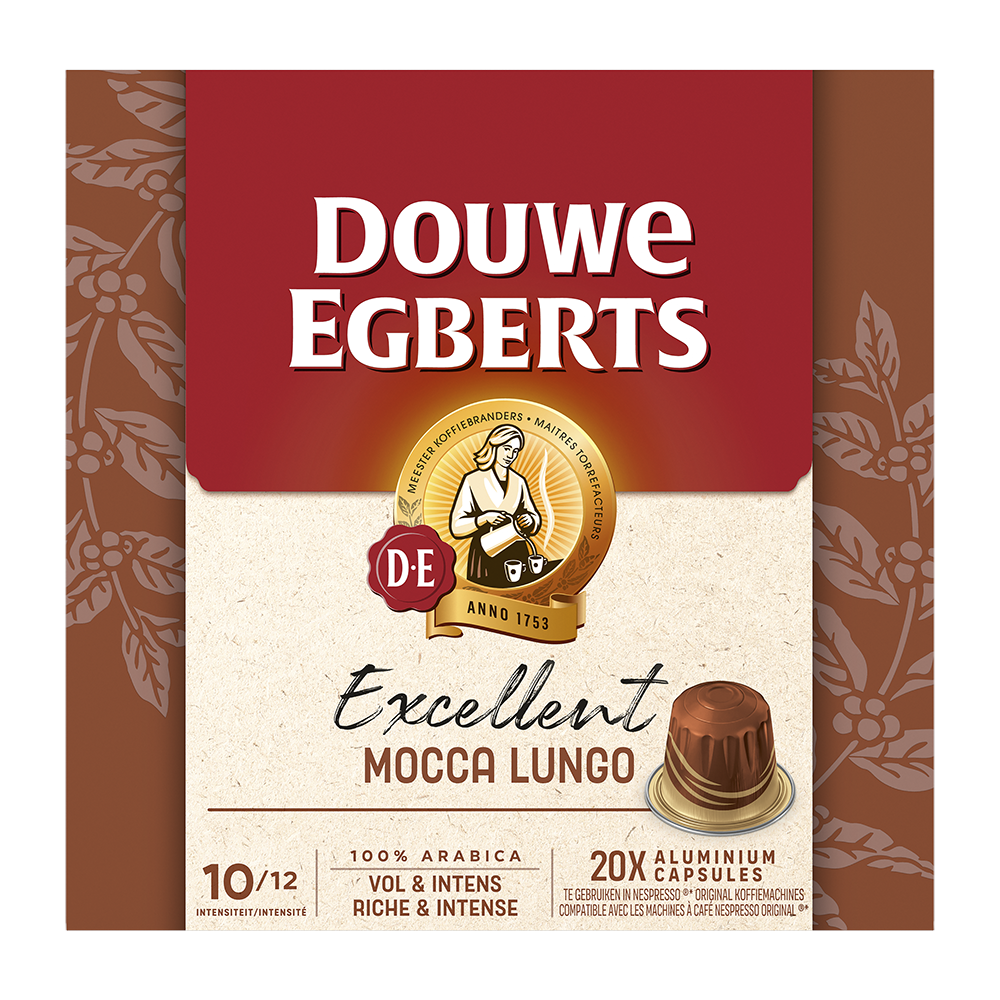 De koffiebonen voor de D.E Excellent Mocca koffiecups zijn langzaam, op lage temperatuur gebrand voor een volle en delicate smaak. Intensiteit 9 uit 12.