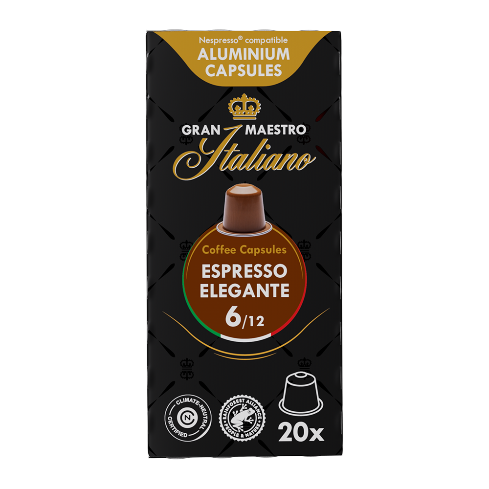 “De Espresso Elegante is een 100% arabica blend van medium roast bonen en is afkomstig uit de beste koffiegebieden van Brazilië en Colombia.”