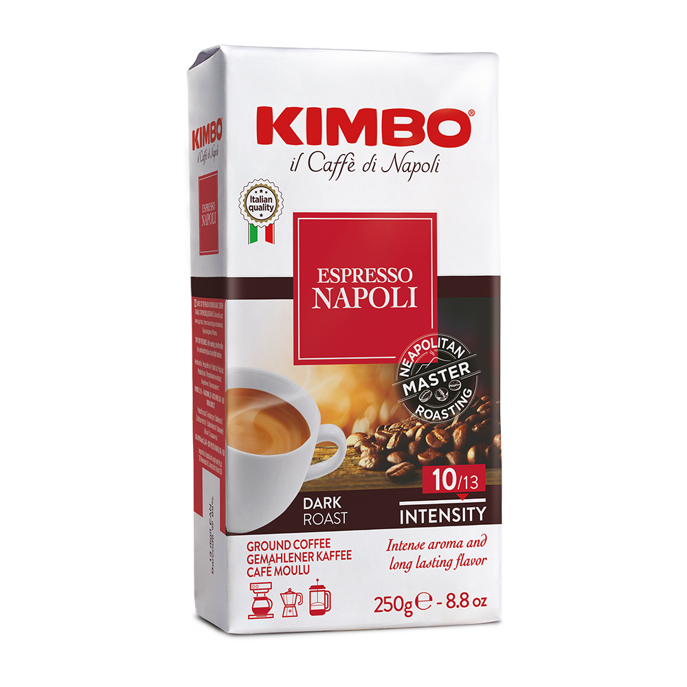 Klassieke Napolitaanse smaakexplosie. Donker gebrande gemalen bonen die een intense smaak geven. Zeer geschikt voor het maken van espresso.