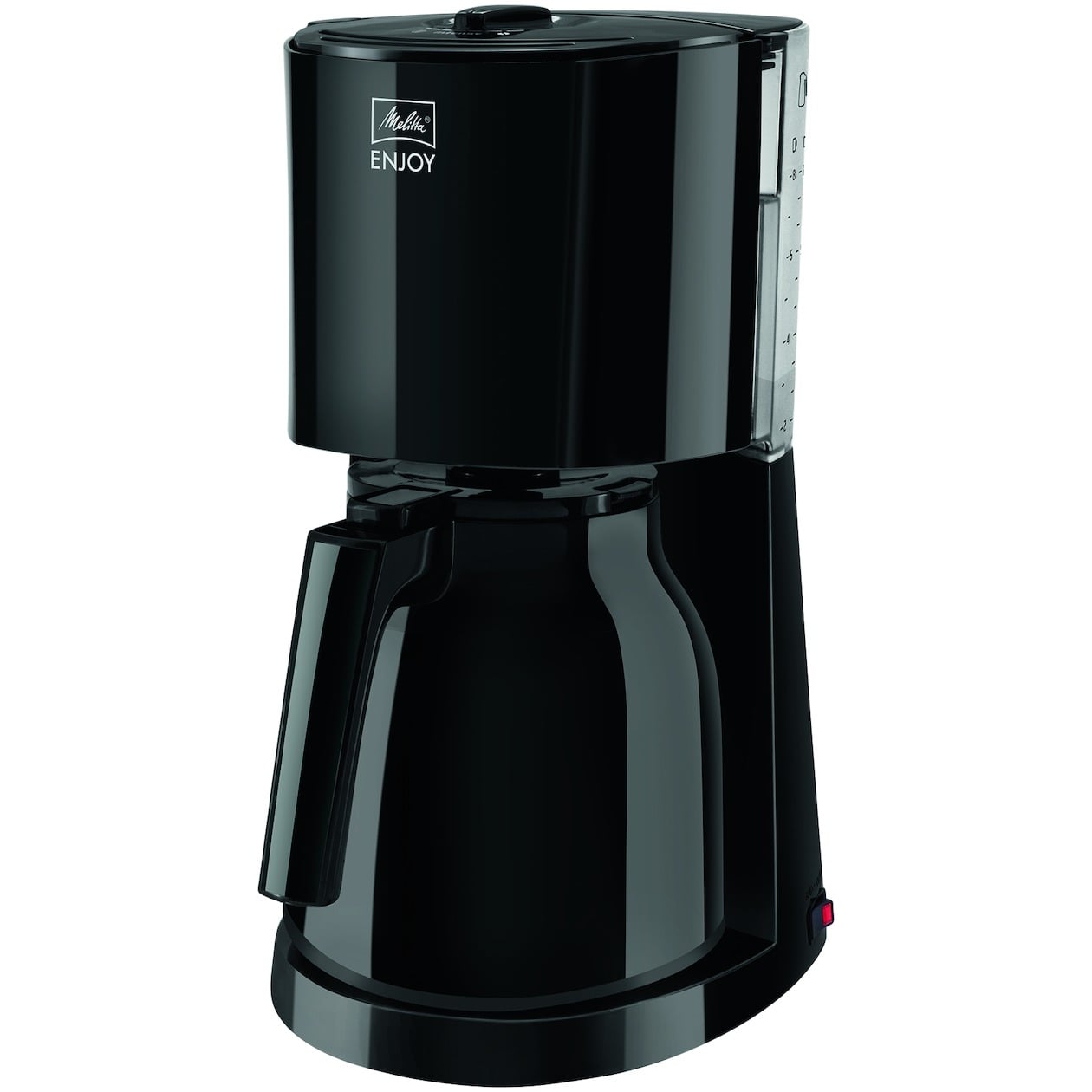 Met de Enjoy Therm van Melitta wordt het heel eenvoudig om optimaal te genieten van uw kopje koffie. Het apparaat is voorzien van de AromaSelector® waarmee de smaak van de koffie met één draai aan de knop kan worden ingesteld. Zo kan iedereen altijd genieten van zijn favoriete koffie: milder of juist sterker. Daarnaast heeft het apparaat ook een warmhoudkan. Dankzij het doorloopdeksel loopt de koffie rechtstreeks in de warmhoudkan. De filterhouder is voorzien van een geïntegreerde druppelstop en is gemakkelijk te reinigen in de vaatwasser. Het apparaat beschikt ook over een voorgeprogrammeerde Auto-Off-functie die het koffiezetapparaat automatisch uitschakelt. U kunt 8 tot 12 kopjes koffie zetten met dit koffiezetapparaat. Aanvullende informatie – Melitta Enjoy Therm Zwart