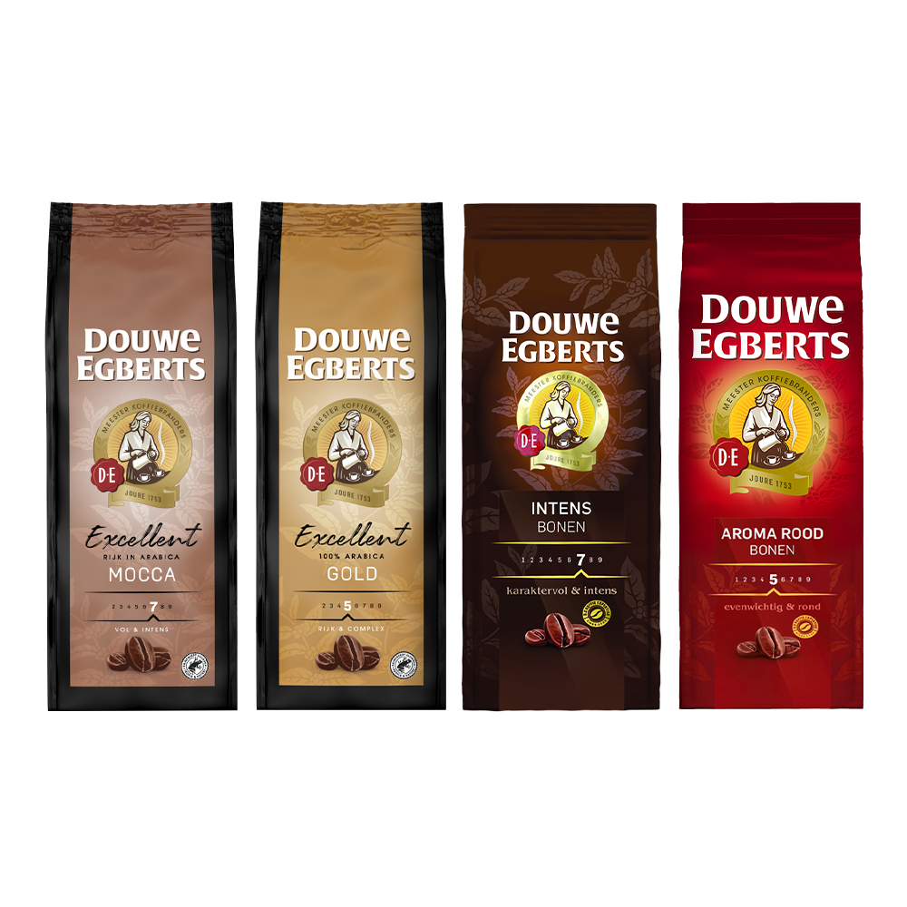 Maak nu voordelig kennis met 4 karaktervolle koffies van D.E met dit proefpakket koffiebonen.
