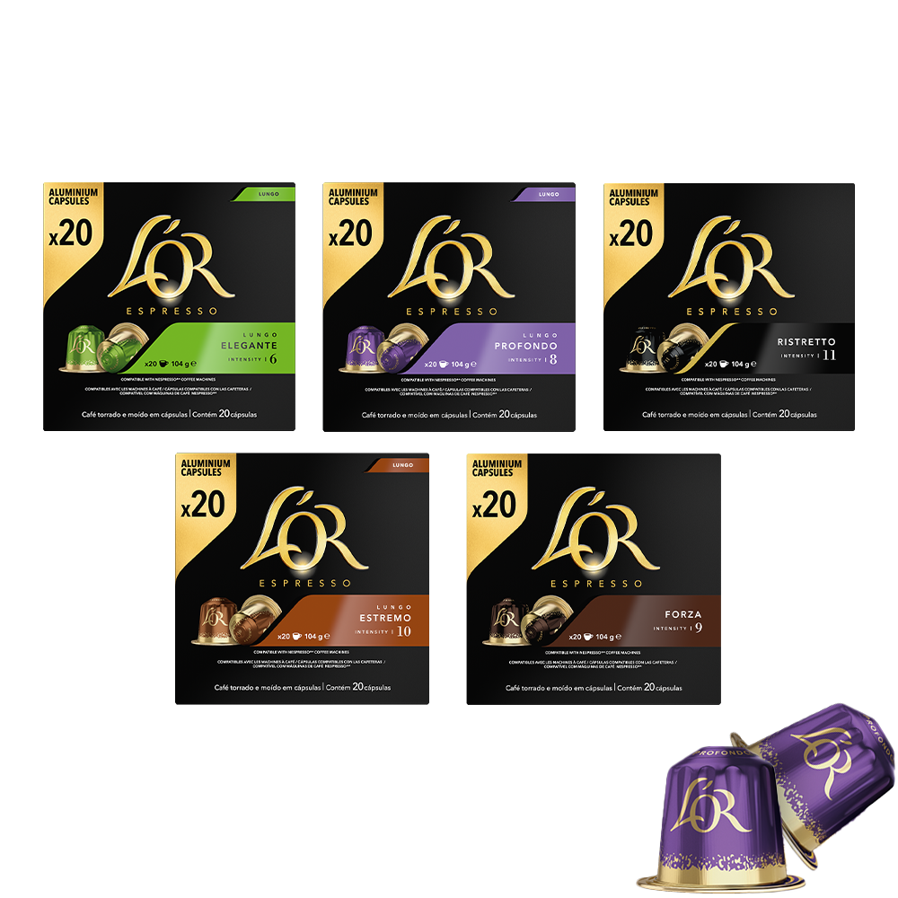 Proef het assortiment van L'OR Espresso. Met 5 luxe koffies in één koffiecups-proefpakket ontdek je eenvoudig jouw favoriete smaak. Altijd extra voordelig.