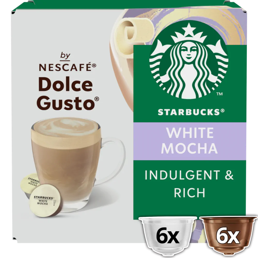6 kopjes chocoladedrank. Witte chocolade!! Ontdek de ultieme verwenner met deze Starbucks Dolce Gusto White Mocha.