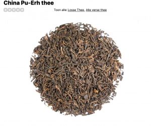 Pu Erh TheeDe thee doorloopt een speciaal rijpingsproces, fermentatie, waardoor de donkerrode kleur en de krachtige aard-achtige smaak ontstaat.Door inwerking van externe bacteriën en gisten fermenteren de theeblaadjes. Deze thee wordt gestoomd, en in plakken, tegeltjes of kogeltjes samengeperst. Daarna wordt de thee te drogen gelegd en opgeslagen om te rijpen